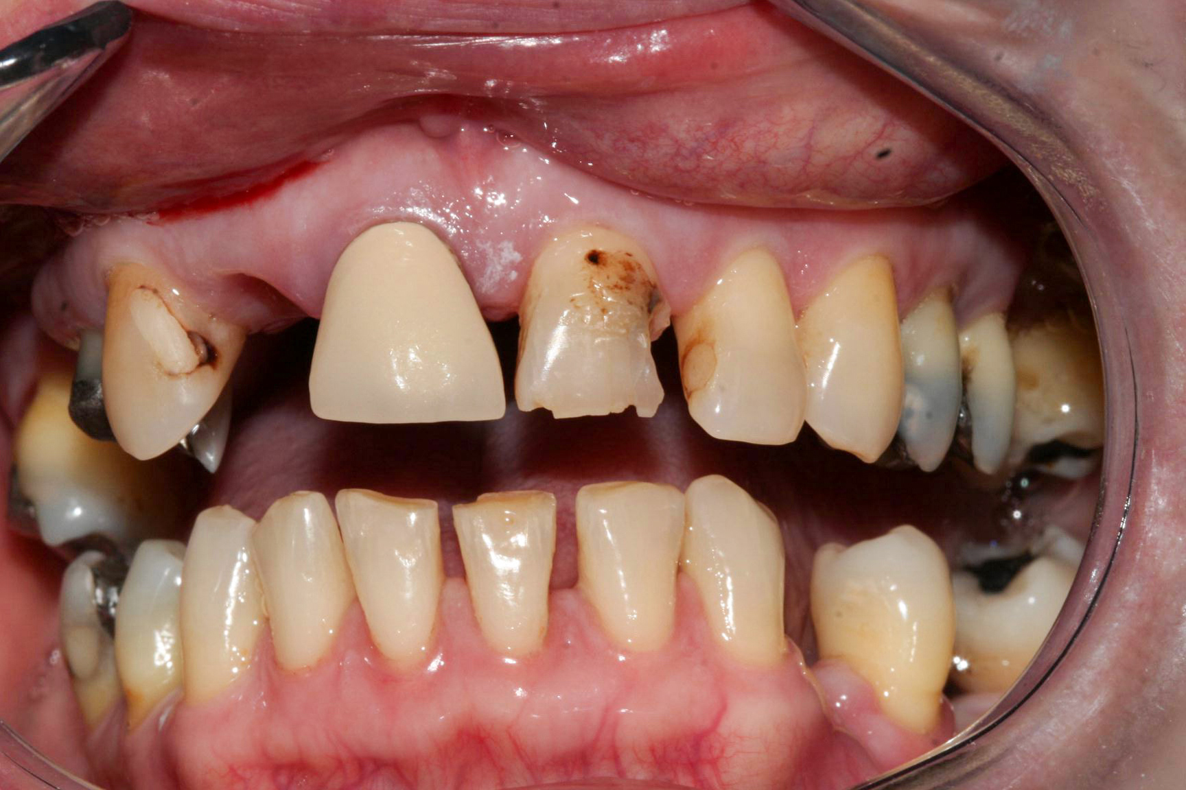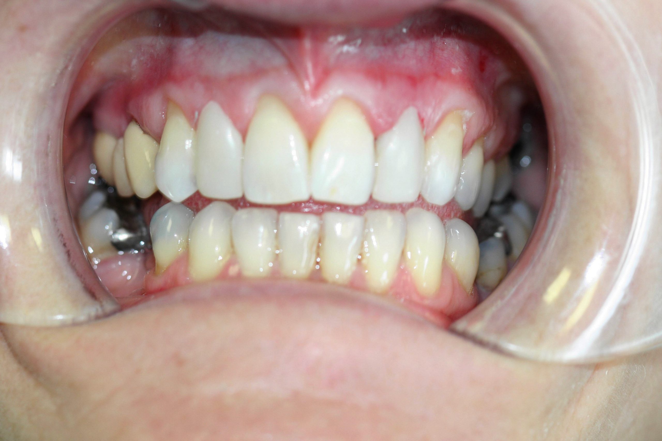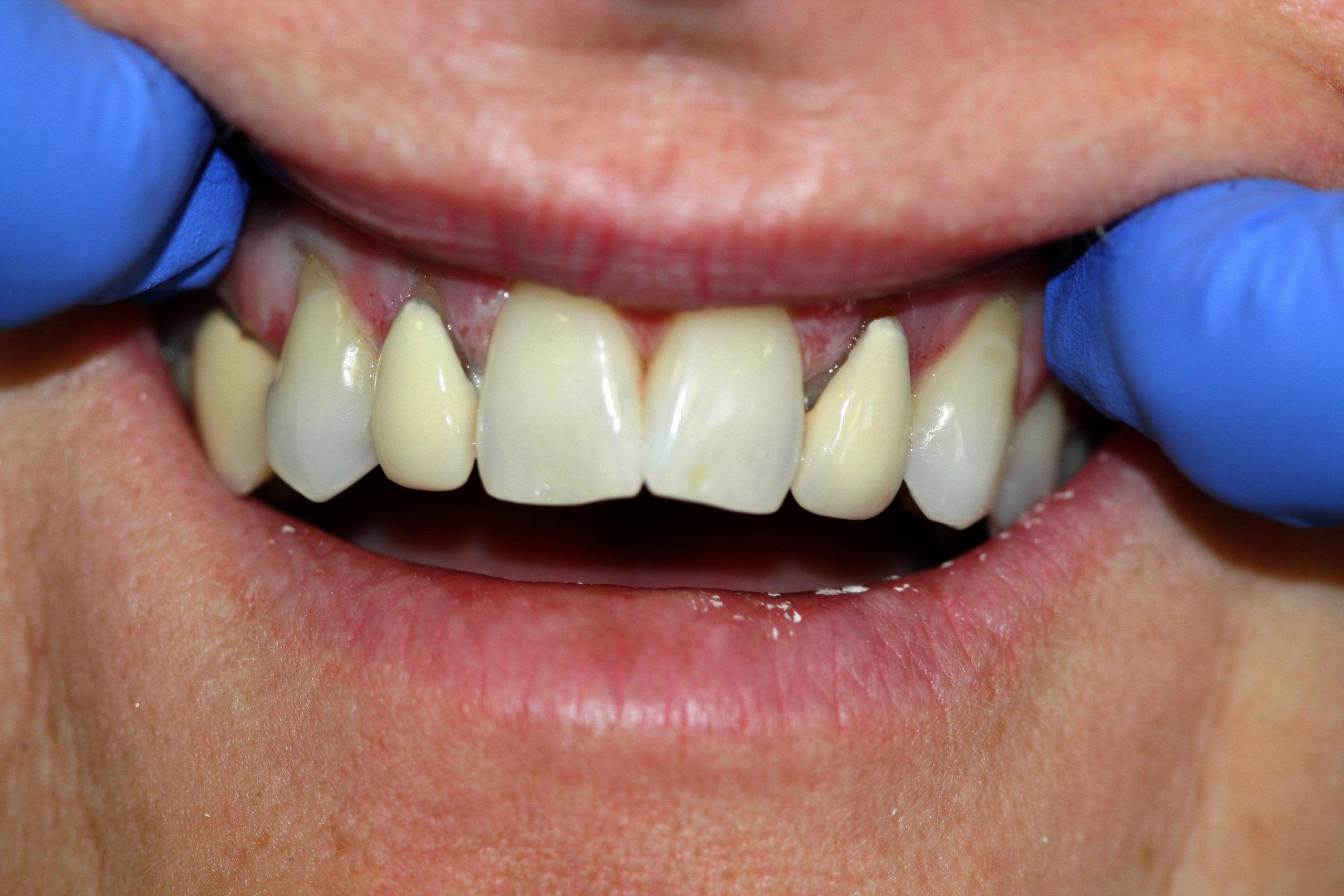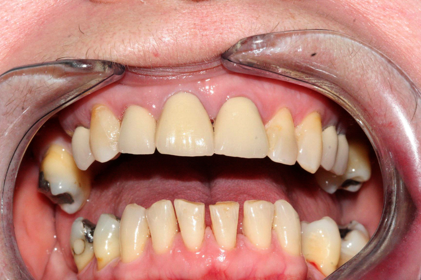 Old NHS crowns replaced with E-max ceramic crowns to hide metal margins